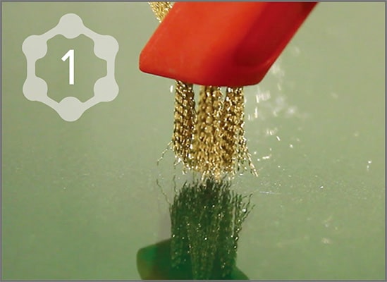 セラミックチェーンの端にナノサイズのマグネットを結合させ記憶ポリマーを形成、形成された記憶ポリマーは、熱を加えることによって本来の形状に自己修復され、温度が下がっても修復された状態のまま維持されます。
